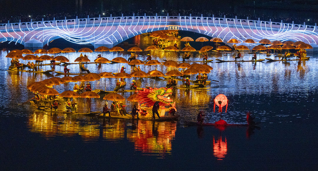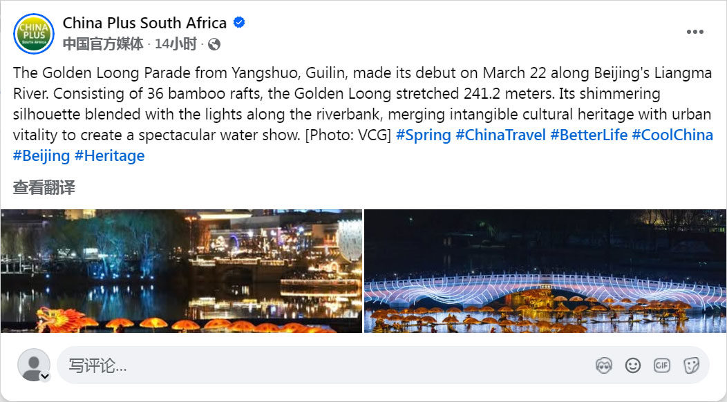 China Plus South Africa The Golden Loong Parade from Yangshuo, Guilin, made its debut on March 22 along Beijing's Liangma River. Consisting of 36 bamboo rafts, the Golden Loong stretched 241.2 meters. Its shimmering silhouette blended with the lights along the riverbank, merging intangible cultural heritage with urban vitality to create a spectacular water show. [Photo: VCG] #Spring #ChinaTravel #BetterLife #CoolChina #Beijing #Heritage (黄佶编辑配图,2026年3月25日) 相关链接: |