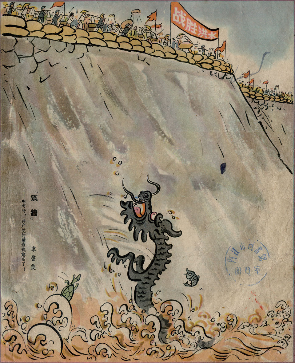 中国现代也有漫画家用黑色的龙象征负面的事物。图5-13-2 这幅作品是 1957年出版的一份《漫画》杂志的封面。图中象征洪水的黑龙望着高高的河堤,无计可施。 |