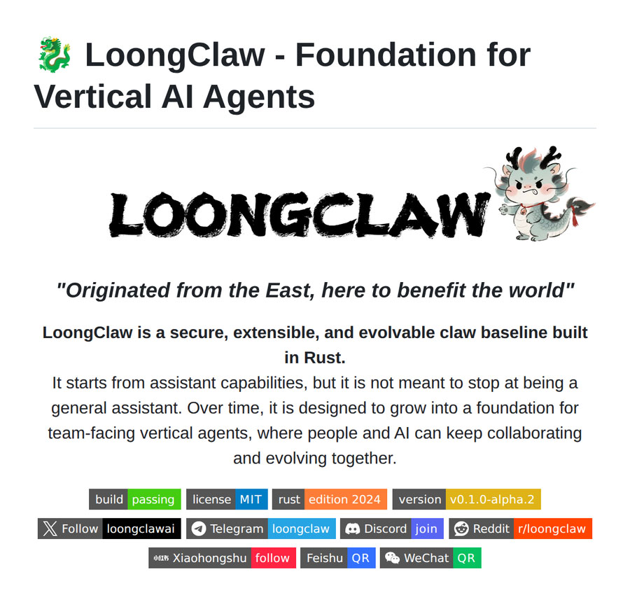 八天前,宣传 LoongClaw 的短视频开始上线。LoongClaw 的界面是中文的,视频说作者是“非 985、211”、“不带名校光环的普通团队”、“非科班出身的草根团队”、“无资源加持的普通人团队”、“没有 985 背景的逆袭团队”、“零背景的一群普通人”、“非科班与大学生混编团队”、”没背景的纯野路子团队”、“带大学生组局的非科班团队”,4月11至 12日将在杭州举办实战训练营。由此可见,LoongClaw 的作者应该是一群中国人。 |