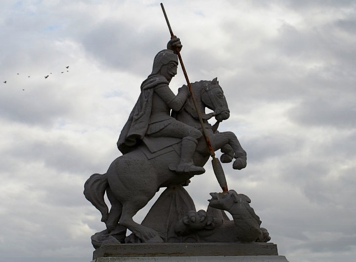伯利恒是耶稣出生之地,圣经新约《启示录》第十二章说耶稣的母亲即将产下他时,有一头杜拉更兽等在边上,打算吞噬婴儿耶稣。难怪在耶稣圣诞之地伯利恒会有这么多英雄杀死杜拉更兽的艺术品。 |