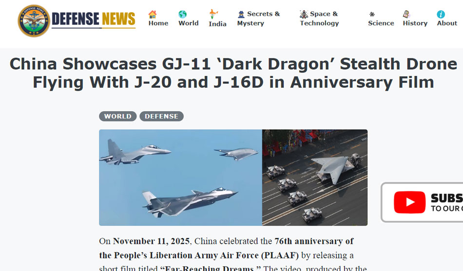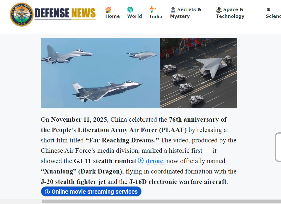 On November 11, 2025, China celebrated the 76th anniversary of the People’s Liberation Army Air Force (PLAAF) by releasing a short film titled "Far-Reaching Dreams." The video, produced by the Chinese Air Force’s media division, marked a historic first -- it showed the GJ-11 stealth combat drone, now officially named "Xuanlong" (Dark Dragon), flying in coordinated formation with the J-20 stealth fighter jet and the J-16D electronic warfare aircraft. Posted on 2025-11-11 16:39:22 https://www.thedefensenews.com/news-details/China-Showcases-GJ-11-Dark-Dragon-Stealth-Drone-Flying-With-J-20-and-J-16D-in-Anniversary-Film/#google_vignette ------------------------------------------- PLA Air Force unveils GJ-11 stealth drone in 76th anniversary film The Chinese People's Liberation Army (PLA) Air Force released an anniversary film on Tuesday featuring footage of aircraft in formation. In the film, a stealth drone called "Xuanlong-08" is seen slowly emerging from a hangar before taking off in formation with two J-20 fighter jets. According to the PLA Air Force, the "Xuanlong-08" is officially designated as the "GJ-11." https://news.cgtn.com/news/2025-11-11/PLA-Air-Force-unveils-GJ-11-stealth-drone-in-76th-anniversary-film-1IdC6vYrA0E/p.html -------------------------- China Showcases GJ-11 Stealth Drone with J-20S Fighter Chinese state media circulated the new video, underscoring a significant advancement in China's military modernization. The footage depicts the GJ-11 as an integral component of advanced air combat formations. This solidifies its role in the People's Liberation Army Air Force's (PLAAF) evolving aerial strategies. Its official designation, Xuanlong, translates to "Fantasy Dragon," reflecting the platform's strategic importance. https://cyberwarzone.com/2025/11/11/china-showcases-gj-11-stealth-drone-with-j-20s-fighter/ -------------------------------- PLA Air Force marks 76th anniversary with more advanced, intelligent equipment On Tuesday, the PLAAF released a 26-minute microfilm on its official social media accounts to mark the anniversary, named Dreaming Far. The film presents the progress of the Air Force from the perspective of an ordinary family living next to an airport, with a few seconds of images showcasing a large drone codenamed Xuanlong-08. In the film, Xuanlong-08 forms a three-aircraft formation with two manned fighter jets, a J-16, and a J-20 codenamed Weilong-1, while the pilot of the J-20 said that the drone has teamed up with his fighter as a loyal wingman. https://www.chinadaily.com.cn/a/202511/12/WS6913dc2ea310fc20369a48cf.html ------------------------------ PLA Air Force Unveils GJ-11 Stealth Drone Flying with J-20 and J-16D in Epic Microfilm Beijing, November 12 - In a groundbreaking display of aerial prowess, the People's Liberation Army (PLA) Air Force has unveiled footage showcasing the GJ-11 stealth drone soaring alongside the J-20 stealth fighter and J-16D electronic warfare aircraft for the first time, marking a pivotal advancement in China's stealth drone technology. Released as part of a commemorative microfilm titled "Far-Reaching Dreams" to celebrate the 76th anniversary of the PLAAF, the 41-second clip captures the trio in seamless formation flight, highlighting the integration of unmanned and manned assets in high-stakes operations. This revelation underscores Beijing's accelerating push toward next-generation air power, where stealth unmanned combat aerial vehicles (UCAVs) like the GJ-11, codenamed "Xuanlong" or Mysterious Dragon, emerge as force multipliers in contested skies. The footage, depicting the drone's hangar departure and synchronized maneuvers with the J-20's "Weilong" Mighty Dragon and the jamming-capable J-16D, signals operational maturity for these platforms in PLA exercises. https://www.aeronewsjournal.com/2025/11/pla-air-force-unveils-gj-11-stealth.html -------------------------------- China unveils footage of GJ-11 "Fantasy Dragon" stealth drone flying with J-20 fighters |